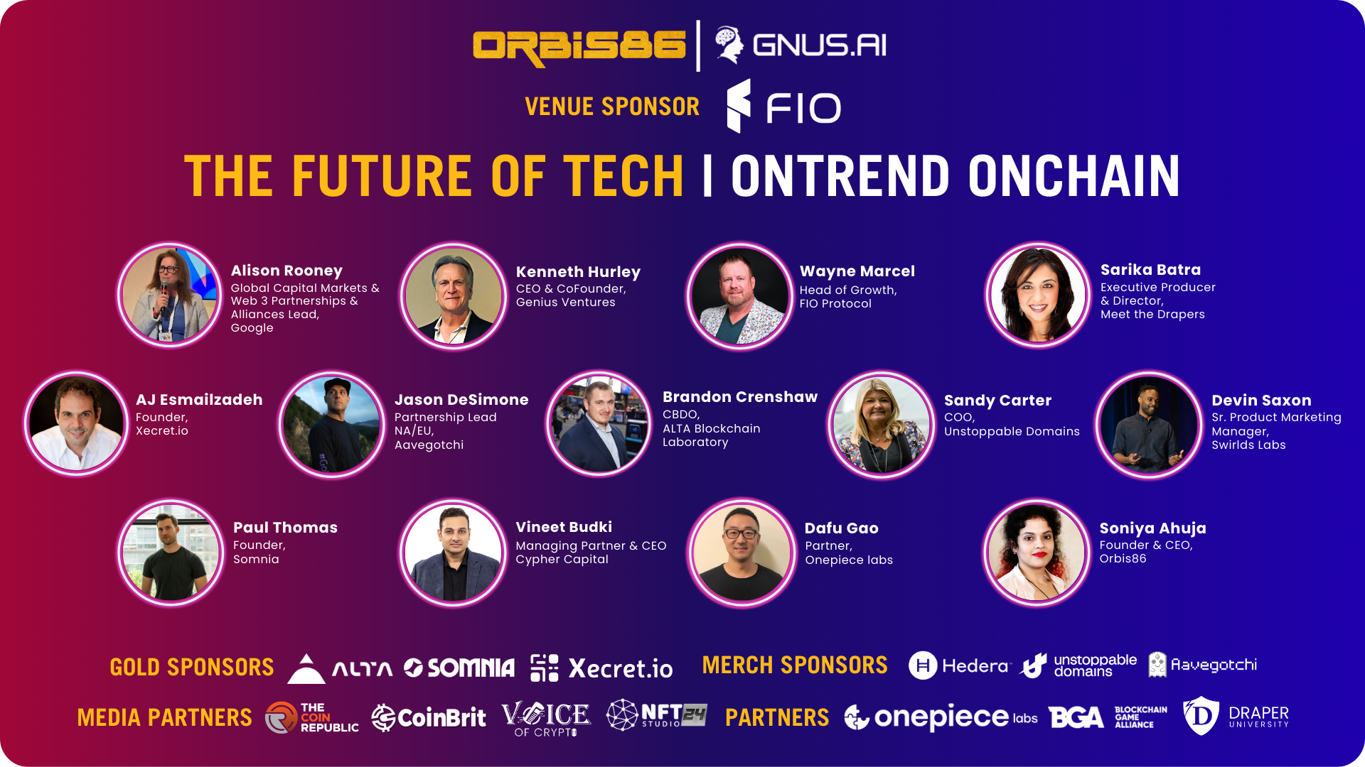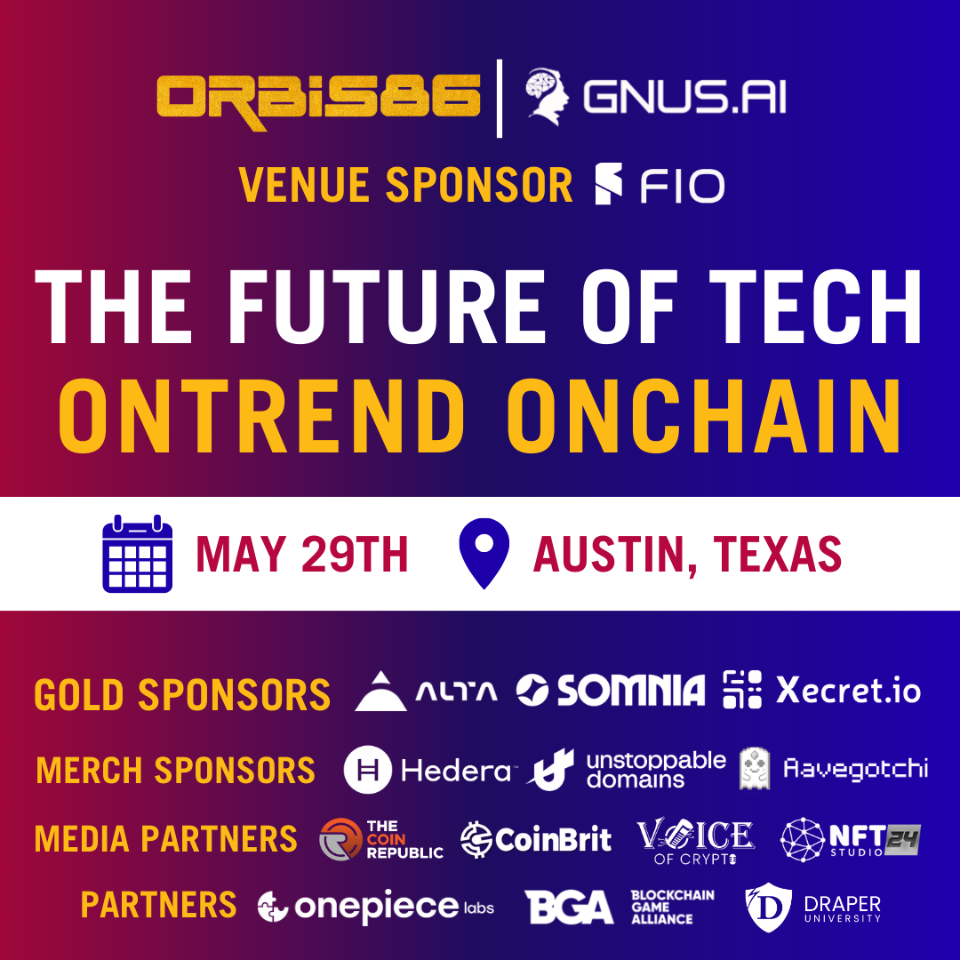 ​Embark on a tech-forward journey with Orbis86 at “Future of Tech: OnTrend OnChain,” as a captivating event during Consensus by CoinDesk in Austin, Texas. Sponsored by GNUS.AI, FIO.net, and ALTA; join us as we delve into the latest trends and opportunities alongside investors, enterprises, and founders.